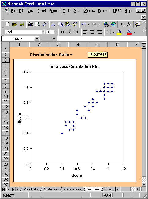 discrimination plot obtained from the AIAG example data set is shown below: