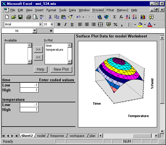 The surface plot worksheet allows the user to change which factors are included in the plot, which automatically updates.